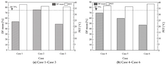 The mean DF value was determined by averaging all the targets’ DF values for each case. The PET is a predicted value taken 1.4 m from the center of the target site. Ta (°C), RH (%), Tmrt (°C), and WS (m/s) were used to predict the PET. Table 6 shows the meteorological factors used for PET prediction.