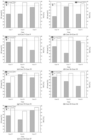 The simulation results were obtained for 27 cases involving outdoor thermal comfort and natural lighting conditions. Figure 7 shows a graph representing the simulation results of the outdoor thermal comfort and natural lighting for the 27 cases. The Y axis represents the outdoor thermal comfort PET index, and the left side of the Y axis represents the mean DF values corresponding to the natural lighting index.