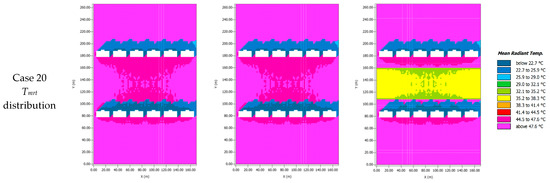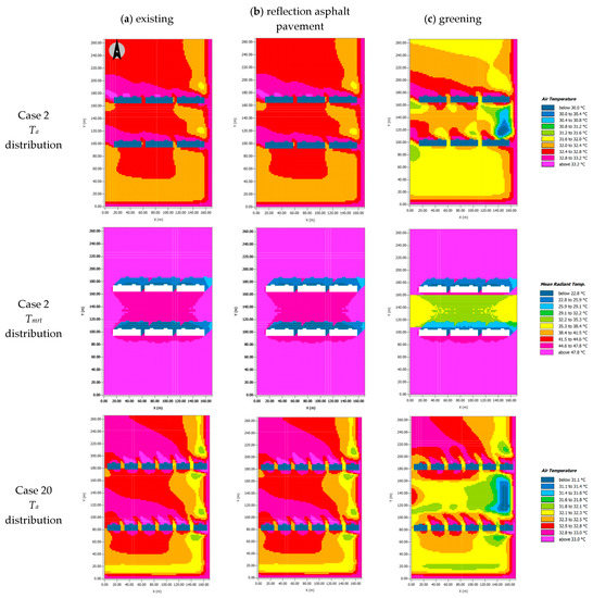 As a result of applying a greening plan, the temperature decreased by 3.0 °C in Case 2 and by 1.9 °C in Case 20. Furthermore, the stress stage is moderate heat stress, which is lower than the current stress stage. The shadows generated by the trees lowered the solar heat gain of the surface and the evapotranspiration lowered the dry bulb temperature and increased the latent heat cooling effect. This result suggests that greening can decrease Ta, improve the microclimate, and reduce heat island effects. Similar to the result of this study, the existing literature also concluded that greening (3 m trees) produces better effects on lowering the surface and air temperatures and mitigates the heat island phenomenon, compared with other factors [86,87,88,89,90,91].