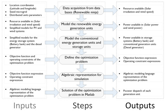 In this section, a methodology for EMS design is presented. The first step consists of acquiring forecast data of the energy resources available in the zone where the microgrid will be installed. In steps two and three, the selection or proposal of mathematical models for conventional and renewables generators and storage units is carried out. In the next step, an optimization problem is identified and consequently defined; in this step, constrains for each generator and the storage unit are defined. In the fifth step, the algebraic representation to simulate the microgrid and solve the optimization problem is presented. The optimization problem is solved, using the MILP approach implemented in Matlab, at the last step. Figure 1 summarizes those six steps, followed in the EMS design, using a flow chart. Moreover, the figure describes the main inputs and outputs of each step. In the following subsections, each step is described in detail.