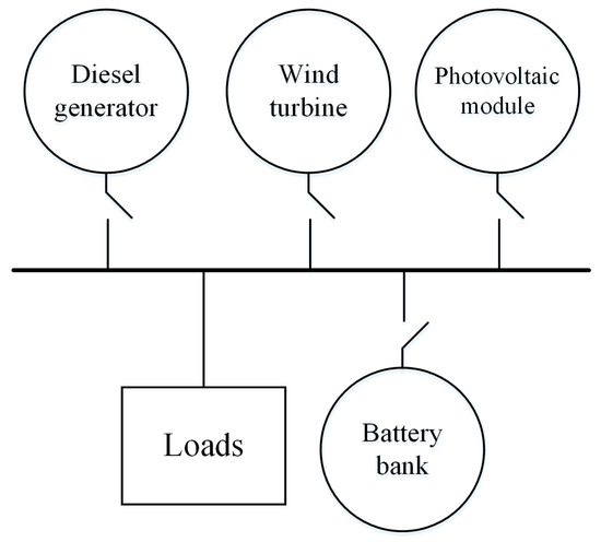 The optimal power dispatch technique proposed in this paper is applied to a realistic microgrid model. The sizing process of the sources and storage unit of the microgrid is reported in [4], where the load profile was also estimated. The study was performed using the meteorological information of the small settlement Taroa, located in la Guajira, Colombia. To support a future implementation of the microgrid, their sources and storage unit models are parametrized with commercial equipment. Moreover, to evaluate the performance of the proposed solution, the same microgrid is operated using the heuristic algorithm reported in [19] for comparison purposes. That algorithm follows a set of rules aimed to reduce the operating cost of the microgrid. Results offered by both approaches, in the form of power dispatch and operating cost calculated in American dollars, are compared to validate the development of the optimal power dispatch. To provide a fair comparison, the same power availability and load demand are used for both approaches. In Figure 2, the line diagram of the microgrid topology is presented; the diesel generator, the wind turbine, the photovoltaic module, the loads, and the battery bank are considered as concentrated elements and are connected to a bus.