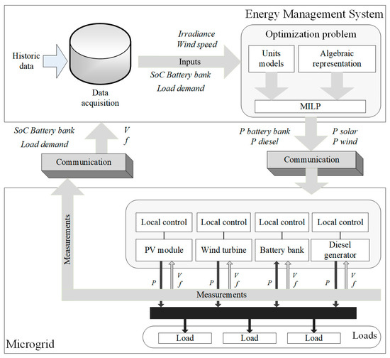 Figure 3 shows the microgrid topology and a flow diagram of both the information and measurements. In the top of Figure 3, the EMS is presented. The inputs for the EMS are the 24-h predictions of the irradiance, wind speed, state of charge of the battery, and the load demand.