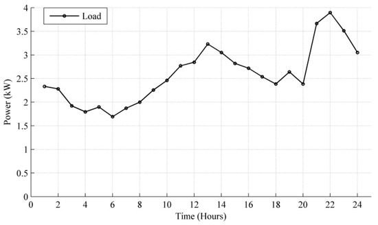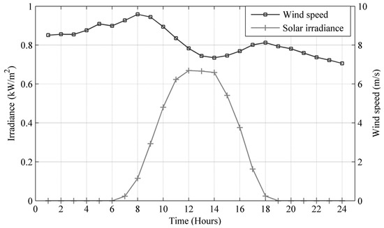 In addition, the database renewables ninja was chosen to obtain the renewable energy resources available in Taroa. Such a database was selected based on the successful experiences reported in [38,39]. Figure 4 shows the irradiance, expressed in kW/m2, and the wind speed, expressed in m/s, corresponding to 24-h average prediction in the region of Taroa. Moreover, Figure 5 shows a load profile calculated for some Colombian non-interconnected areas, which are completely remotes from urban cities and are inhabited by native cultures that are rich in customs that differ from the customs practiced in urban areas. The load curve presented in Figure 5 is proposed by a government institution for the specific studied area. However, another specific or a typical load profile can be used to solve the optimization problem. The information reported in Figure 4 and Figure 5 is used to solve the optimization problem and to calculate the dispatch using the EMS.