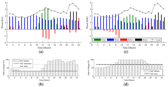 In Figure 7c,d, the power dispatch of the microgrid and the SoC of the battery bank calculated using the heuristic algorithm is presented. Because the heuristic algorithm only has one limit programed for the state of charge, the battery bank is not dispatched during the first hours because the SoC of the battery is below the SoCmin. That situation forces the algorithm to dispatch the diesel generator. Then, at 8 am, the available power in the renewables sources overcomes the load demand, and the battery bank is charged during the next three hours until it reaches the SoCmax. At night, there is a reduced amount of renewable power, and the algorithm prevents the SoC going below 70%. During the night, the power demanded by the load increases significantly, hence the algorithm dispatches the diesel generator to supply load demand and to keep the battery ready to supply power for the next day.