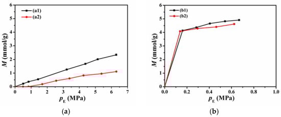 Adsorption isotherms of different pure gases (H2, C3H6) with different zeolitic imidazolate framework-8 (ZIF-8) conditions at 293 K: (a) (H2), (b) (C3H6), b1 (with solid ZIF-8) and b2 (with a ZIF-8 slurry, which was suspended in water with a mass concentration of 15 wt %).