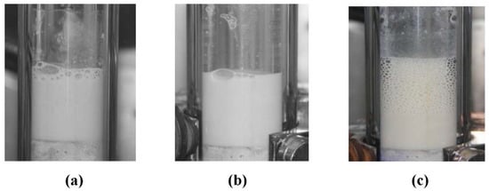 The morphology of the ZIF-8/water slurry during the separation of a C3H6/H2 mixture. (a) Fresh ZIF-8/water slurry; (b) separation equilibrium slurry; and (c) gas desorption process for ZIF-8/water slurry.