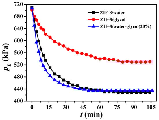Kinetic curves for the ZIF-8 slurry containing different liquid media at 293.15 K and fixed initial pressure of 700 kPa. The solid content of ZIF-8 is 20 wt % for each slurry. The mass ratio between water and glycol in the ZIF-8/water-glycol slurry is specified to 4:1.
