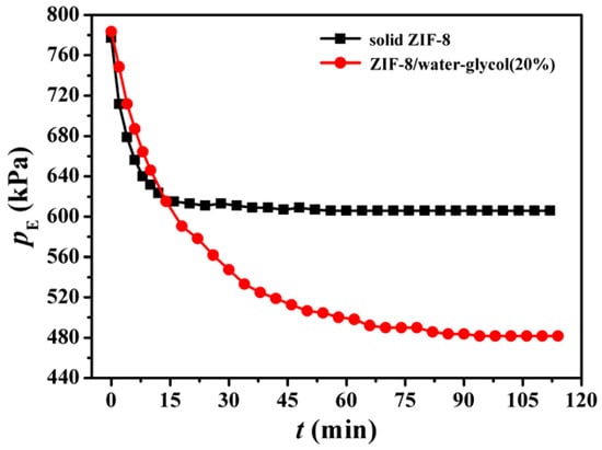 As shown in Figure 7, under the same initial pressure, solid ZIF-8 can quickly reach equilibrium (20 min), but the pressure drop is less than that observed for the slurries. This is mainly due to the aggregation of the dry materials. Internal materials can hardly make contact with the gas, resulting in poor gas-solid mass transfer. The adsorption separation process was completed quickly. For the slurries, continuous stirring can ensure homogenous adsorption of the gas within the slurry. As a result, good gas-liquid mass transfer is observed, and the time required for the mass transfer process to occur is longer.