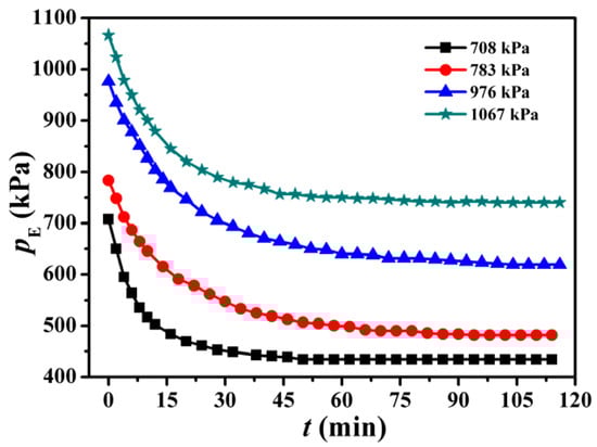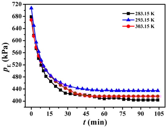 In Figure 8, we compare the dynamic curves at the different initial pressures. At low pressure, the dynamic curve is steep and the equilibrium time is fast. At high pressure, the pressure drop is relatively large, mainly because as the initial pressure increases, more of the gas enters the solution to be separated, and the equilibrium is pushed towards the separated product. Therefore, the time for the gas-liquid mass transfer process is increased. After the reaction, the mass transfer rate tends to be slow. Figure 9 compares the dynamic changes at different temperatures. The results show that increasing the temperature is helpful for accelerating the reaction rate. High temperatures allow the pressure to reach equilibrium in a relatively short time. Low temperatures are conducive to dissolving the gas and pushing the equilibrium towards separation. The reaction shows a greater pressure drop at lower temperatures. However, the difference in the equilibrium time and pressure drop at different temperatures and the different initial pressures is not very obvious, so the temperature and the initial pressure do not have a significant effect on the dynamics.