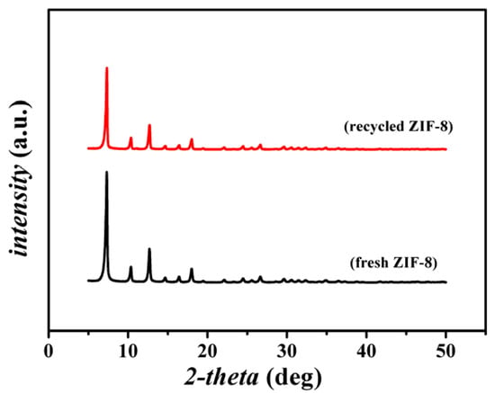 A comparison of the XRD patterns of the fresh ZIF-8 and ZIF-8 samples that were in over 10 experiments is shown in Figure 10. From Figure 10, we can see that there is no difference in the two XRD patterns, and all peaks completely overlap. In addition, as shown in Figure 11, it can be found that the morphology of ZIF-8 samples that were used in over 10 experiments is almost the same with that of the fresh ZIF-8, indicating that the ZIF-8 remains intact after repeated use.