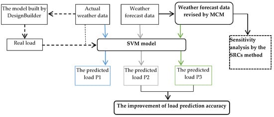 In this paper, the MCM is used to analyze the uncertainties of weather forecasting parameters, and the model based on SVM is established to forecast the cooling load of an office building. In addition, the Standardized Regression Coefficient (SRC) method for sensitivity analysis is introduced comprehensively. The flowchart shown in Figure 1 depicts the main steps in developing the research, which facilitates the understanding of the proposed approach.
