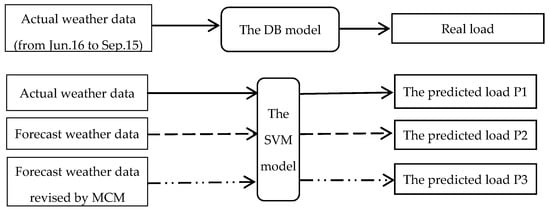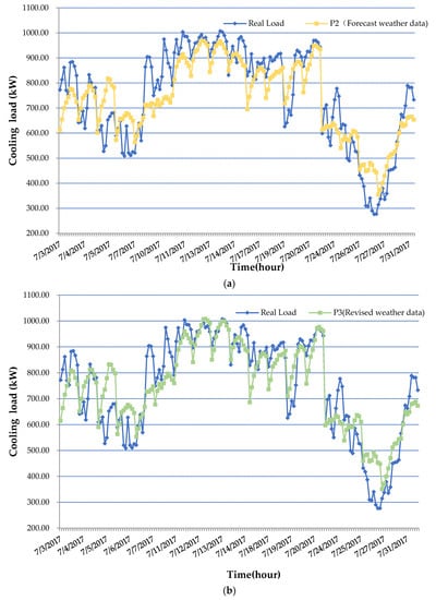 In (a), P2 is the forecasting load adopting weather forecast data, and in (b), P3 is the forecasting load adopting the weather forecast data dealt with MCM.