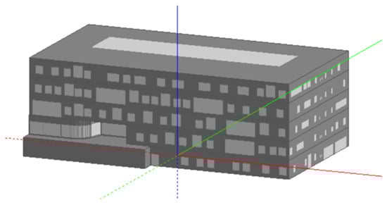The final model created by the DesignBuilder software version 4.2.0.015 is shown in Figure 4. DB is the most comprehensive Graphical User Interface to the Energy Plus simulation engine which is widely used for modeling [35]. Parameters of the building structure are obtained through research, and other parameters refer to “Tianjin Public Building Energy Efficiency Design Standards” (DB 29-153-2014) for setting, such as personnel density, personnel per room rate, lighting density, running time. The heat source is supplied by the district heating pipe network in winter, and the terminal of the air conditioning system is the fan coil system, while it uses the split Variable Refrigerant Volume (VRV) air conditioning system for cooling in summer. It is difficult to obtain the hourly cooling load by measurement. In addition, the HVAC systems of the office building are normally used from Monday to Friday and are not used on weekends and holidays. Therefore, only the loads from 9 a.m. to 5 p.m. on weekdays are considered in the scope of the study of load forecasting. The error analysis of the simulated hourly heating load and the measured heating supply data from 9:00 to 17:00 for three working days is carried out to verify the simulation.