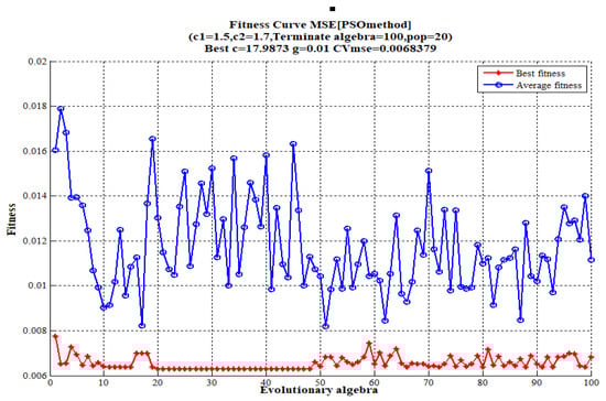 The particle swarm optimization algorithm is used to optimize the parameters of the support vector machine, where we set , where g is γ in Equation (10). The particle swarm optimization algorithm hyper-parameter optimization results are: . Figure 6 shows the results of the fitness function of the particle swarm optimization algorithm.