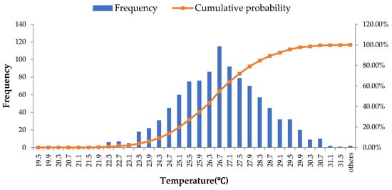 For example, for forecasting the load at 9 o’clock on 3 July, it is known that the 1-h-ahead weather forecast dry bulb temperature of the prediction moment T(h–1) is 27.2 °C. The result of the random sampling for T(h–1) using the MCM based on 1000 runs of the model is shown in Figure 9. The most frequent values of T(h–1) in the results of random sampling simulation are near 26.7 °C. Actually, the error ∆w obtained by random sampling is −0.6 through calculation, and the revised weather forecast data T(h–1)* is 26.6 °C, which means that the expected value of T(h–1) is 26.6 °C and is closer to the real weather data, i.e., 26.0 °C.