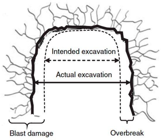 Some of the earliest research [1,2,3] stated over-break as the only major consequence of the blast damage. It was defined as the unwanted loosening, dislocation, and disturbance of the rock mass beyond the limits of the intended excavation design. Figure 1 illustrates a clear distinction between the over-break and the blast damage [4]. This paper employs numerical models to consider blast-induced damage as the region beyond the final excavation boundary, where the rock has been damaged by blasting.