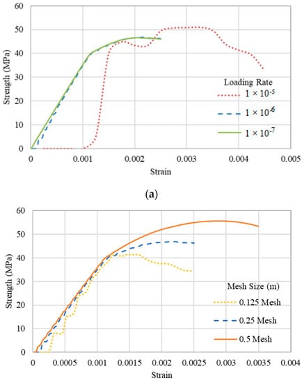 Loading rate can be either stress-controlled or strain-controlled. It is recommended to use strain-controlled loading rates to obtain reliable stress strain graphs [28]. The model run time and the stress strain curve are dependent on the loading rate. To understand the effect of loading rate, a pillar with W/H ratio of 1.0 was applied with three different loading rates. Table 1 shows that the model run time increases exponentially with decreasing loading rates. Figure 3a shows that with low loading rates, the models obtained good and reliable stress strain graphs.