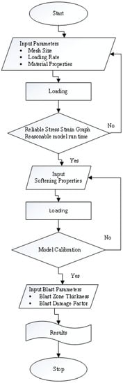 To simulate the blast damage in the model, rock properties were changed to degraded rock properties in the blast-damaged zones with the help of FISH code (an inbuilt function in FLAC3D for developing user-defined variables and functions), as shown in Figure 4. That shows the blast damage zone’s thickness was 0.5 m, whereas the Young’s modulus, Mohr-Coulomb cohesion, and Mohr-Coulomb friction were altered in the blast-damaged zones using Equations (4)–(6) for blast damage factors (D) of 0.25, 0.5, 0.75, and 1.0 and are presented in Table 4. A flowchart has been developed representing step-by-step procedure for numerical modeling of pillars in FLAC3D, as shown in Figure 5.