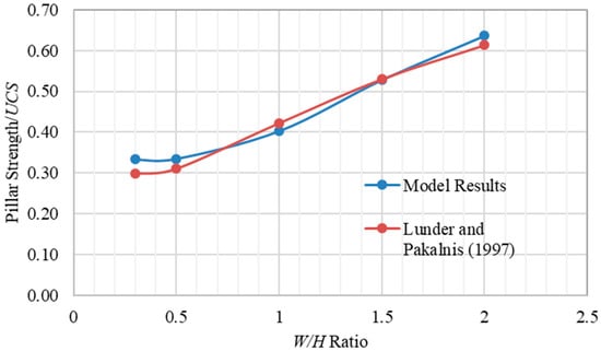 The models were created at pillar W/H ratios of 0.5, 1.0, 1.5, and 2.0. The pillar height adopted in these models was about 4 m, which is similar than the pillar height in Lunder’s database [18]. The strength results were obtained through the stress strain curves developed by FISH code. The model strength of the pillars was then calibrated to that of the theoretical results, as shown in Figure 6. It was observed that the difference between the model results and the theoretical results was less than 5%.
