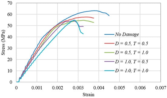 For this, five models were analyzed with a W/H ratio of 1.5 and five different blast damage combinations: D = 0 and T = 0 m, D = 0.5 and T = 0.5 m, D = 0.5 and T = 1.0 m, D = 1.0 and T = 0.5 m, and D = 1.0 and T = 1.0 m. The stress strain curve of these models is shown in Figure 7. It can be observed that the modulus of the pillars decreases with an increase in disturbance factor and damage thickness. The stress strain curve of the pillar with no damage shows a point (40 MPa) where the modulus changes which can be denoted as the pillar transitioning from brittle failure to shear failure. This transition happens in the pillar from blast damage with a disturbance factor of 0.5 at 48 MPa and blast damage with a disturbance factor of 1.0 at 54 MPa. It can be deduced that with the increase in blast damage, the tendency of the brittle failure increases in the pillars. Finally, it can be observed that the pillar with a W/H ratio of 1.5, disturbance factor of 1.0, and damage thickness of 1 m undergoes complete brittle failure.