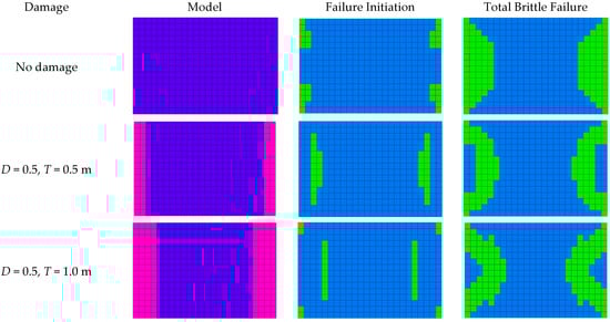 To understand the failure behavior of the pillars with blast damage, failure regions were observed from the plastic state plot to better describe the regions undergoing plastic flow. These plots can be used to determine which regions have or are undergoing shear and tensile failure. The plots show the failure regions at the central section of the pillar, as shown in Figure 8. Three points on the stress strain curve in Figure 7 were selected that correspond to the plastic state plots in Figure 8. The points were selected at the following stages: before loading began, at the pillar failure initiation, and at the transition point between brittle and shear failure. The before-loading point shows the pillar with massive rock and degraded rock in the model, while the failure-initiation point shows the crack initiation in the pillar, and the transition point shows the total brittle failure in the pillar.