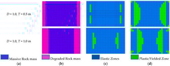 Next, the failure regions were analyzed in a pillar with a disturbance factor of 1.0 and a damage thickness of 0.5 m, which is shown in Figure 8b. In Figure 8c, it can be observed that the failure initiates in the massive rock mass due to the softening effect in the degraded rock mass caused by blasting where stresses get transferred to the massive rock. In Figure 8d, it is observed that the degraded rock mass is so weak that it does not provide any confinement to the core, which increases the brittle failure of the pillar and decreases the region for shear failure. Therefore, the overall strength of the pillar decreases significantly.