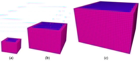 The loading rate is largely dependent on the mesh size. Past numerical studies on pillars have adopted large meshes [29,30,31] and therefore employed higher loading rates. The relationship between the mesh size and loading rate was defined with the help of stress strain graphs. It was found that smaller mesh sizes needed very low loading rates, and as the mesh size increases, higher loading rates can be employed. Three mesh sizes were varied to understand the stress strain behavior at a 1 × 10−6 m/step loading rate. This loading rate serves well for 0.5 m and 0.25 m meshes. For 0.125 m mesh, the loading rate seems to be higher, resulting in bumps in the stress strain curve (Figure 3b). The smaller mesh size also results in higher model run times. Optimization of the loading rate, mesh size, and model run time is required to obtain a good stress strain graph. Therefore, a 1 × 10−6 m/step loading rate is suitable for a mesh size of 0.25 m × 0.25 m × 0.25 m and has been used throughout this paper.