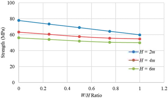All the models discussed to this point assumed a pillar height of 4 m. The effect of blast damage on a pillar with a W/H ratio of 1.5 at different pillar heights was also analyzed. Figure 9 shows pillars at three different heights (2 m, 4 m, and 6 m), each with a damage thickness of 0.5 m. Since this now incorporates different pillar heights, the strength of the normal pillars was analyzed at different pillar W/H ratios. Figure 10 shows that shorter pillar heights represent higher strength, while larger pillar heights lead to lower strength, in accordance with Kaiser [24].
