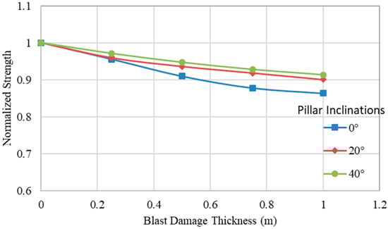 The effect of blast damage on inclined pillars (Figure 12) was evaluated next. The strength of the inclined pillars with a height of 4 m and a W/H ratio of 1.5 were evaluated with a blast damage factor of 0.5 at different blast thicknesses. It was determined that the strength of the inclined pillars is less susceptible to blast damage. Figure 13 shows the decrease in strength of the pillars at 0, 20, and 40 degrees of inclination with a W/H ratio of 1.5 and a damage factor of 0.5 at varying blast thicknesses. Given that that inclined pillars have less strength than vertical pillars, the 10% decrease in pillar strength because of blasting in inclined pillars would lead to significant strength reduction.