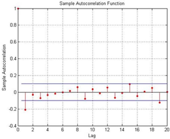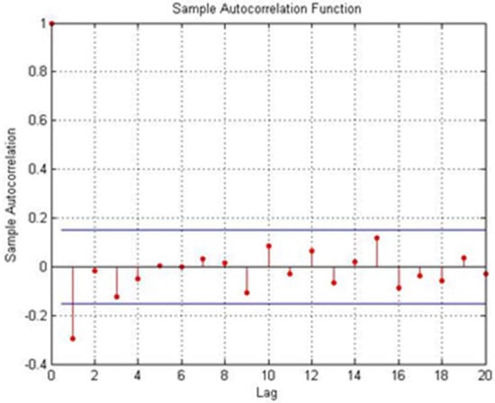 After differencing, data were prepared to be modeled by an interval autoregressive process. Hereinafter, we present the interval autoregressive process for k = 1 in detail. According to the fuzzy time series (see Table 1) starting on 1 March 2017 and ending on 31 March 2018, ; we created interval time series; (see Figure 5). Since the interval time series was non-stationary, we have done first-order differencing and obtained the following stationary series: (see Figure 7). The obtained stationary series was then expressed in the form of a midpoint and radius (see Table 3).