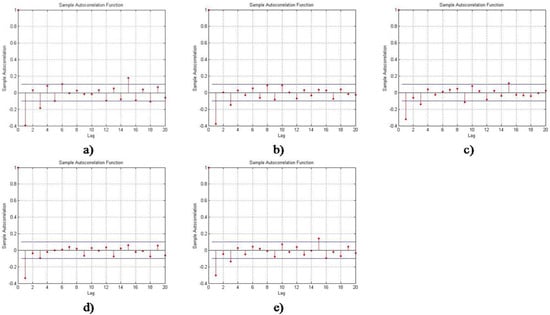 Autocorrelation function for: (a) three fuzzy states; (b) four fuzzy states; (c) five fuzzy states; (d) six fuzzy states; (e) seven fuzzy states.