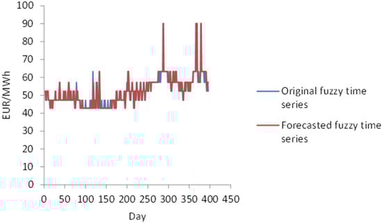 Original fuzzy time series and forecasted fuzzy time series of monitored electricity price.