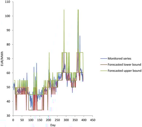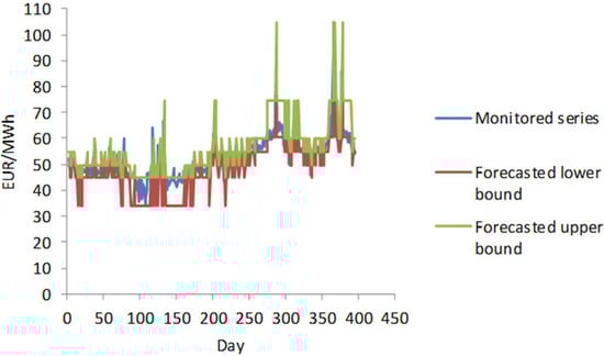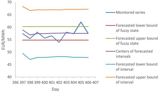 Absolute percentage error of the model for 4 March 2017 is:. Mean absolute percentage error that regards the original fuzzy time series and forecasted fuzzy time series of monitored electricity price is 4.95%. The Akaike information criterion (AIC) for AR(1) is 3.173 and the Schwartz–Bayesian information criterion (SBIC) is 3.183. According to Equations (25) and (26), the mean absolute percentage error that regards the daily monitored electricity price and forecasted interval time series is 5.43%. Results of the model are represented by Figure 9.
