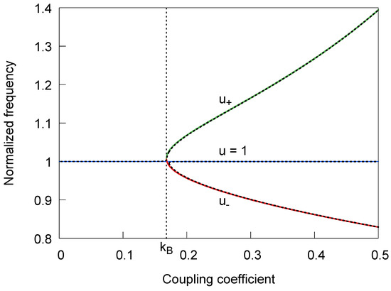 The main resonant frequency u = 1 and the secondary frequencies as function of the coupling coefficient k for the example configuration. Frequency bifurcation occurs for a coupling factor k higher than the bifurcation coupling . The solid lines indicate the results for the approximate admittance matrix , the dashed lines for the exact admittance matrix .