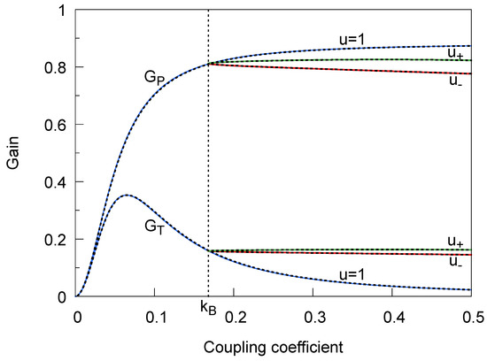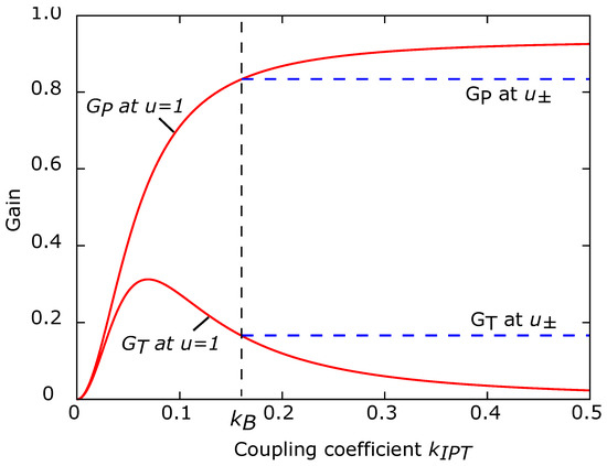 The continuous lines show the gains and at the main resonant frequency u = 1 as function of the coupling coefficient for the example IPT configuration. The dashed lines indicate the values at the secondary resonant frequencies , valid for .