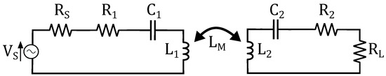 CPT utilizes the electric field as means to transfer power wirelessly, whereas IPT uses the magnetic field. The equivalent network for IPT is shown in Figure 4. A voltage source with internal resistance supplies the transmitter. The inductances and are coupled by their mutual inductance . The coupling factor is given by .