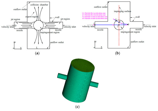 Geometric model of the impinging stream reactor: (a) x-z plane; (b) particle motion zone; and (c) mesh model.