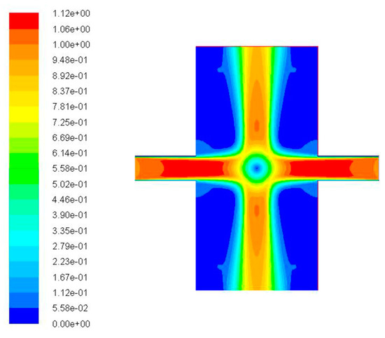 Figure 2 shows the velocity contour map of Case 1. It can be seen that the two opposite fluid impinging at the geometric center of the collision chamber, and the flow regime is steady and symmetric with respect to impinging surface at Case 1.