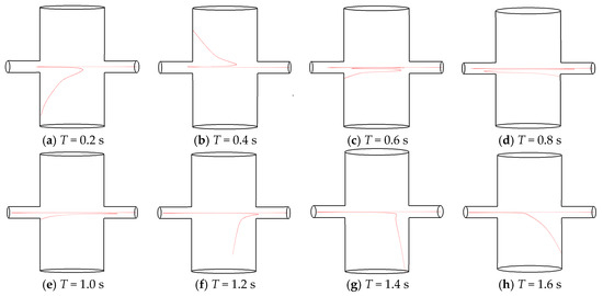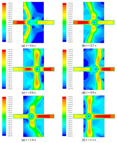 Figure 3 shows velocity contour maps of Case 2 with T = 0.6 s. It can be seen from Figure 3 that the location of the impinging surface oscillates in the x-direction, due to the dynamic inflow conditions within one period. It can be inferred that impinging surface changes moving direction every half-period. The simulated gas motion behavior is consistent with the study of Erkoc [29] and Li [30]. A similar fluid transport phenomenon is also obtained in Cases 3 and 4. In summary, the flow regime of Case 1 is steady and the impinging surface lies in the x = 0.1 m plane, while the flow regimes of Cases 2–4 vary with time and the impinging surface undergoes oscillatory motion within one period.