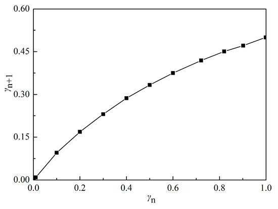 Figure 4 shows the functional form of γn+1 on γn in the traditional impinging stream reactor based on Equation (25). In Figure 4 γn+1 increases when γn increases, but γn+1 is weaker than γn due to flow resistance. Thus, it can be determined from Figure 4 that both γn and the particle’s maximum axial kinetic energy (0.5u2pi,max) greatly decrease (close to zero) after every oscillation. Finally, the particles leave the active area. It can be inferred that decreasing the particle maximum axial kinetic energy can shorten the particle residence time after every oscillatory motion.