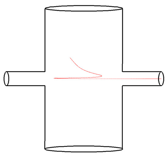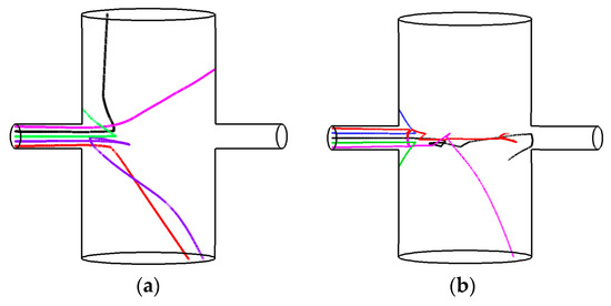 Figure 13 shows common particle trajectories for Case 1. Both left and right particles impinge with each other in the impingement region, since the impingement region is stably located at the geometric center of the collision chamber in the traditional impinging stream reactor, as shown in Figure 3. Additionally, in Figure 13, the particles accelerated by the original fluid scatter in all directions after collisions. Most particles do not undergo oscillatory motion, but rather very fast deceleration in the original fluid, before quickly leaving the active area.