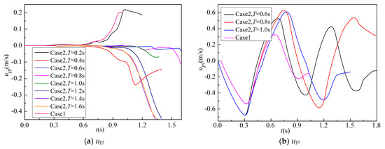 In the first oscillatory motion of the asymmetric impinging stream reactor where u1 = a and u2 = b ≠ a, at t = tmac,1 ≈ 0.3 s the particles’ axial velocity reaches a maximum value, i.e., upimax,ac,1 = ui, while at t = tmd,1 ≈ 0.5 s the particle axial velocity reaches zero. Since the impinging surface moves very slowly after t ≥ tmac,1 when T/2 ≥ tmac,1, the jet acceleration zone stays nearly the same and the flow regime basically remains constant. Thus, it is at 0.6 ≤ T ≤ 1.6 s that the first acceleration zone is the same. Additionally, instantaneously moving the impinging surface, changes the moving direction every half-period. For T/2 = 0.3 s or 0.4 s, a single particle completes its first acceleration, and then flows into the right-moving impingement region where a large velocity gradient exists. This reduces the increasing degree of the radial velocity to a great extent, and radial velocity of the particle is close to zero at T = 0.6 s and T = 0.8 s. In Figure 7a the radial particle velocities for T = 0.6 s and T = 0.8 s are much smaller than those of other periods in Case 2 after the third oscillatory motion. The results of Figure 7b show that the number of oscillatory motions at T = 0.6 s and T = 0.8 s are larger than that of other periods in Case 2. Specifically, when T/2 ≥ tmac,1, the particle makes oscillatory motions five times in Case 2 at T = 0.6 s, four times at T = 0.8 s, and three times at T = 1.0 s and in Case 1. Thus, xtot increases with a decrease of T, as shown in Figure 6c–e.