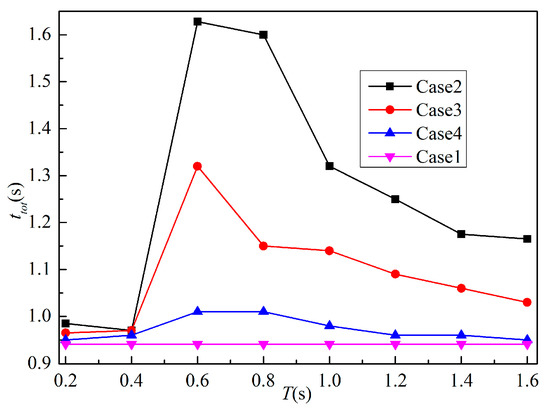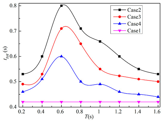 Similarly, the residence times of Cases 3 and 4, as shown in Figure 8, are basically the same as that of Case 2. That is, ttot reaches a maximum value at T/2 = tmac,1 = 0.3 s in all cases. Increasing the inlet velocity difference (∆u) can improve the maximum axial particle velocity in each oscillatory period and makes the particle remain longer in the active area, compared with the traditional impinging stream reactor under equal mean inlet velocity. Thus, ttot increases with an increase of ∆u at the same T. Overall, the particle residence time is closely related with period and inlet velocity difference of the dynamic inflow conditions.