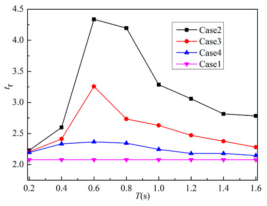 Figure 9 shows the effect of T on the tr. Based on abovementioned analysis of the single particle residence time in different cases, ttot reaches a maximum value at T/2 = tmac,1 = 0.3 s in Cases 2–4, as shown in Figure 8. The first acceleration time (tac,1) has little change with different periods for the different cases. To normalize out this effect, we define tr as the ratio of the oscillatory time to tac,1, which reflects the performance on the particle residence time at different T and ∆u under the same mean inlet velocity. Based on the definition of tr, tr reaches a maximum value at T/2 = tac,1 in the different cases since the tac,1 are approximately equal. Thus, the variation of tr (Figure 9) with T is the similar to that of ttot (Figure 8). On the other hand, Figure 9 shows the effect of ∆u on tr for the different studied cases. The ttot increases with increasing ∆u at the same period, so tr increases with an increase of ∆u. We can find from Figure 9 that the impinging stream reactor with dynamic inlet flow has a larger oscillatory time, i.e., larger tr, over the traditional impinging stream reactor at equal um. Increasing tr means enhancing the particle’s residence time in the active area of the impinging stream reactor. tr reaches a maximum value at T/2 = tac,1. Therefore, the impinging stream reactor with dynamic inlet flow provides a higher cost performance over the traditional impinging stream reactor under equal um in terms of the particle residence time.
