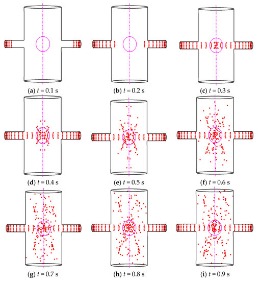 Figure 10 shows the simulated particle motion behavior at different moments in Case 1. It can be observed in Figure 10 that the highest particle concentration is in the impingement region, which is approximately axially symmetric with respect to the impinging surface. Few particles penetrate the reverse fluid to decelerate in Case 1. Both right and left particles accelerated by corresponding original jets frequently impinge with other particles in the vicinity of the impinging surface, and then spread away from the impingement center. This behavior is in accorded with the actual characteristics of multi-particles’ motion in the traditional impinging stream reactor [40]. Meanwhile, due to the interparticle collisions, the mean particle’s oscillation time trends to zero, i.e., tosc ≈ 0. Based on the multi-phase transport phenomenon and the definitions of tr, the interparticle collisions greatly shorten the particle’s residence time. It can be inferred that most particles make no oscillatory motion in the active area due to collisions in the impingement region. Thus, interparticle collisions restrict the motion range of most particles to the scope of the impingement region, which greatly shortens the mean particle residence time compared with the single-particle motion characteristic shown in Figure 6. Therefore, the particles’ frequent collisions in the impingement region improves the heat and mass transfer between particles [1], but limits the particle motion range and shortens the particle mean residence time in the traditional impinging stream reactor.