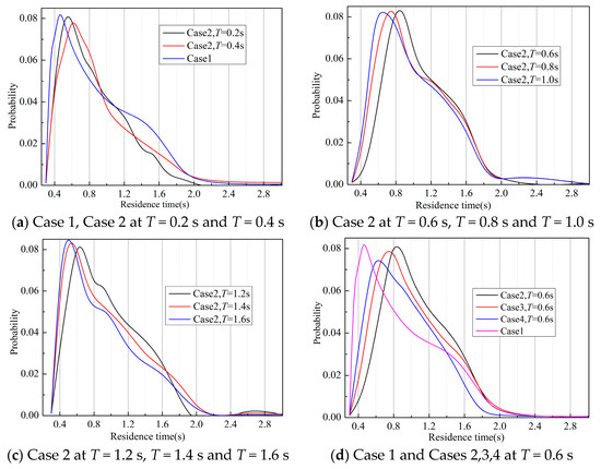 Generally, a single particle initially lying on the nozzle axis undergoes oscillatory motion three times, and the radial velocity greatly increases at last oscillating motion, which makes the particle quickly flow away from the active area. Figure 8 shows the particle residence time at different cases. It can be determined from Figure 8 that ttot, T=0.6 s > ttot, T=0.4 s > ttot, T=0.2 s > ttot, Case 1. This is probably because the period increases with increasing maximum axial kinetic energy and prolongs the particle residence time in the opposite fluid, that is when T/2 < tmac,1 = 0.3 s. From the abovementioned information, for tmac,1 ≤ T/2 ≤ tmd,1 = 0.5 s, ttot increases with decreasing T due to an increasing number of oscillatory motions. When tmd,1 ≤ T/2 ≤ 0.8 s, increasing T can shorten the particle’s second and third oscillatory motions. Thus, ttot decreases with increasing T for tmac,1≤ T/2 ≤ 0.8 s and ttot reaches a maximum value at T/2 = tmac,1. Therefore, the curve of Case 2 shown in Figure 8 accords with our theoretical expectations for the particle motion.