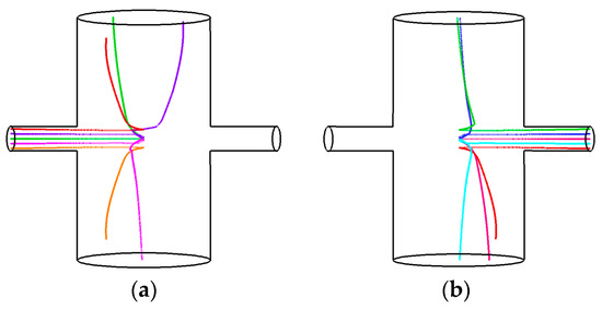 Common particle trajectories for Case 1: (a) left particles; and (b) right particles. Each color represents a different particle.