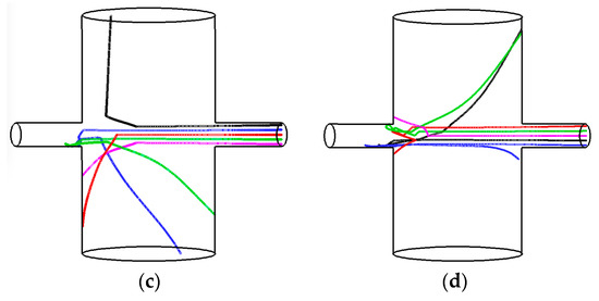 Figure 14 presents common particle trajectories for Case 2. Due to the instantaneously moving impinging surface, the particle trajectories of Case 2 are much more complicated than those of Case 1. It can be observed in Figure 10 and Figure 11 that the particle motion range of Case 2 is larger than that of Case 1. Some particles accelerated by the large fluid velocity pass through the impinging surface, while the remainder of the particles accelerated by the weak fluid velocity reverse motion direction after particle collisions. At the same time, the impingement region is moving, which causes the corresponding particles to either be accelerated again by the original fluid or to enter the reverse fluid, resulting in oscillatory motion. However, a small number of particles directly move away from the active area due to the effect of the particles’ collision on the enhancement of the radial particle velocity. Thus, in Figure 14a left particles’ trajectories show that particles make no oscillatory motion. For the particles in Figure 14b, some particles are accelerated again by the original fluid after a collision and thus undergo oscillatory motion at least once. In Figure 14 c,d most of the right particles also undergo oscillatory motion at least once. This is probably because the particles pass through the impinging surface and then penetrate the reverse fluid, and even into the reverse nozzle before finally leaving the active area. As a result, the particle motion range can be greatly increased. Similar particle trajectories as those mentioned above can also be obtained in Cases 3 and 4. Therefore, in terms of the particle trajectory, compared with the traditional impinging stream reactor under the same um, the complexity of particle trajectories increases. In addition, most particles undergo oscillatory motion at least once and the particle motion range is greatly enhanced, even filling the entire axial area of the collision chamber in the impinging stream reactor with dynamic inlet flow.