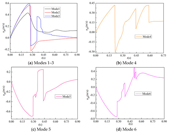 Characteristic axial particle velocity as a function of time in the six different motion modes as labeled.