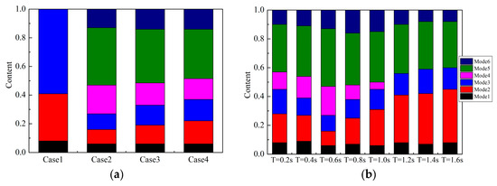 Motion mode content in each motion mode for the different cases; (a) Fixed T = 0.6 s, and varying other cases; and (b) Case 2 while varying the inlet period T.
